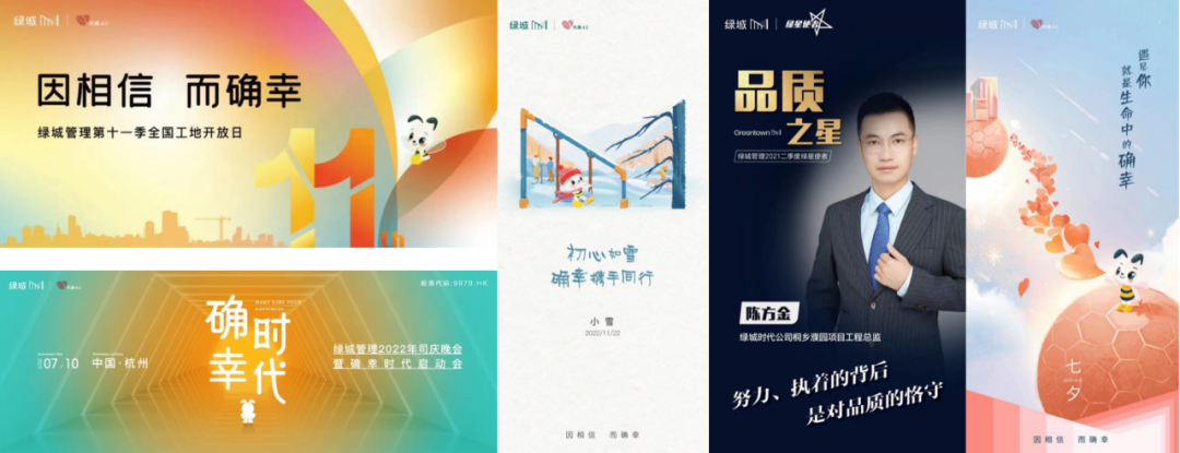 智讯“反碎片”方法论,协助绿城管理在已有条件下,扩大品牌效应。应用于品牌日常的海报中,长期使用,起到视觉连接品牌的效果,形成绿城管理独特的视觉资产。
