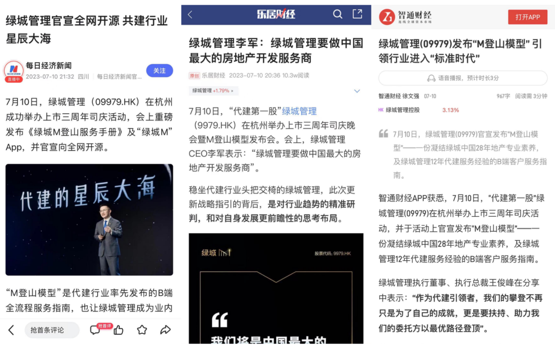 7月10日,绿城管理在杭州成功举办上市三周年司庆活动,重磅发布“M登山模型”及“绿城M”App,并官宣向全社会开源。