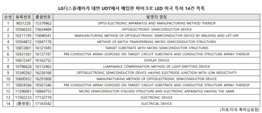 (LG显示从台湾UDT购买的14件Micro LED美国专利目录)