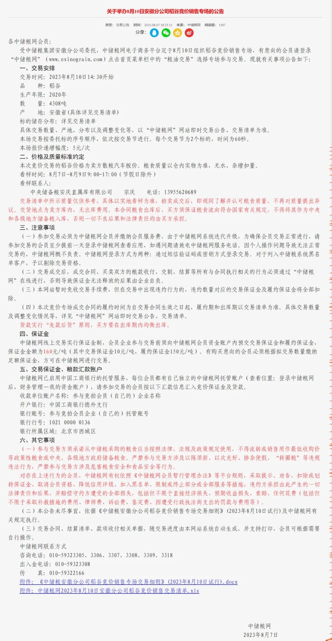 关于举办8月10日安徽分公司稻谷竞价销售专场的公告
