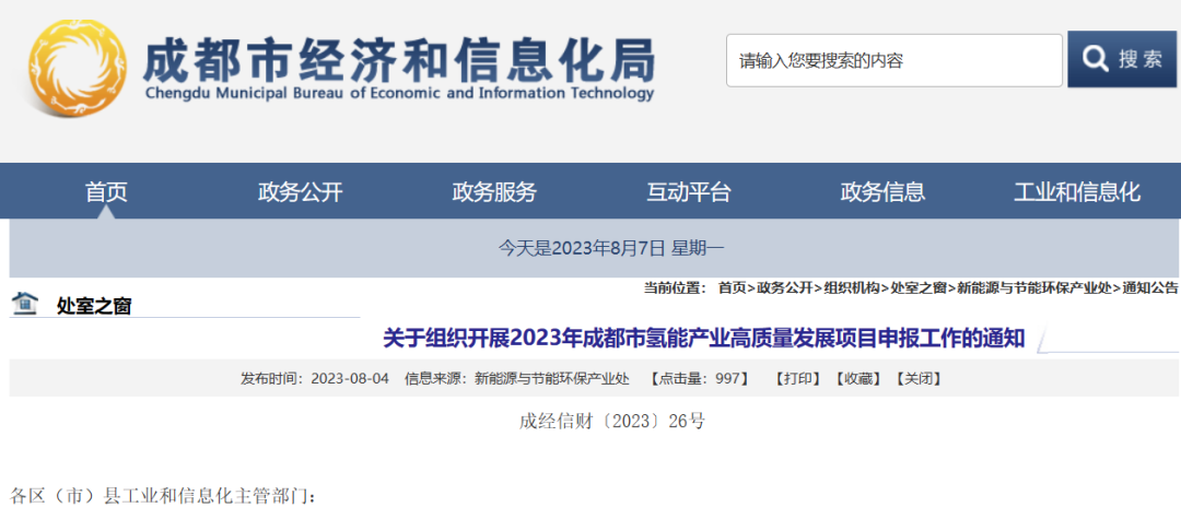 8月4日,成都市经信局发布了关于组织开展2023年成都市氢能产业高质量发展项目申报工作的通知。文件对降低氢气存储企业成本、降低氢气运输成本、加氢站建设、加氢站运营补贴、扩大产业链关键零部件应用规模、拓宽氢能示范应用场景项目、开通跨城市氢燃料交通示范线项目、并购氢能企业、氢能特色产业园运营补贴等分别进行补贴。