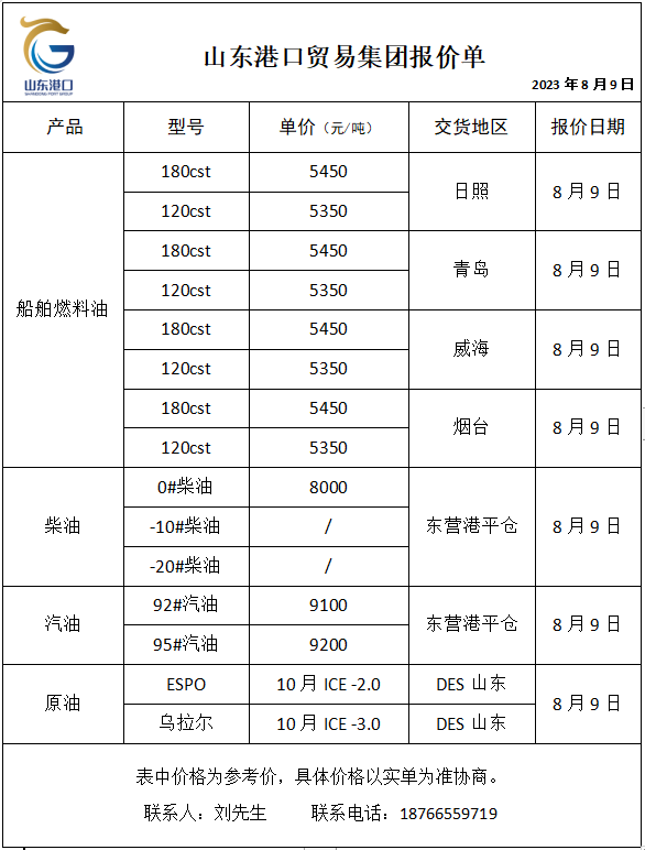 山东港口贸易集团油品报价(8月9日)
