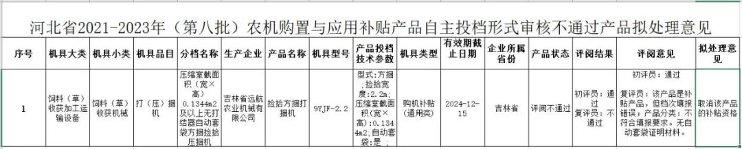 河北省2021-2023年(第八批)农机购置与应用补贴产品自主投档形式审核不通过产品拟处理意见