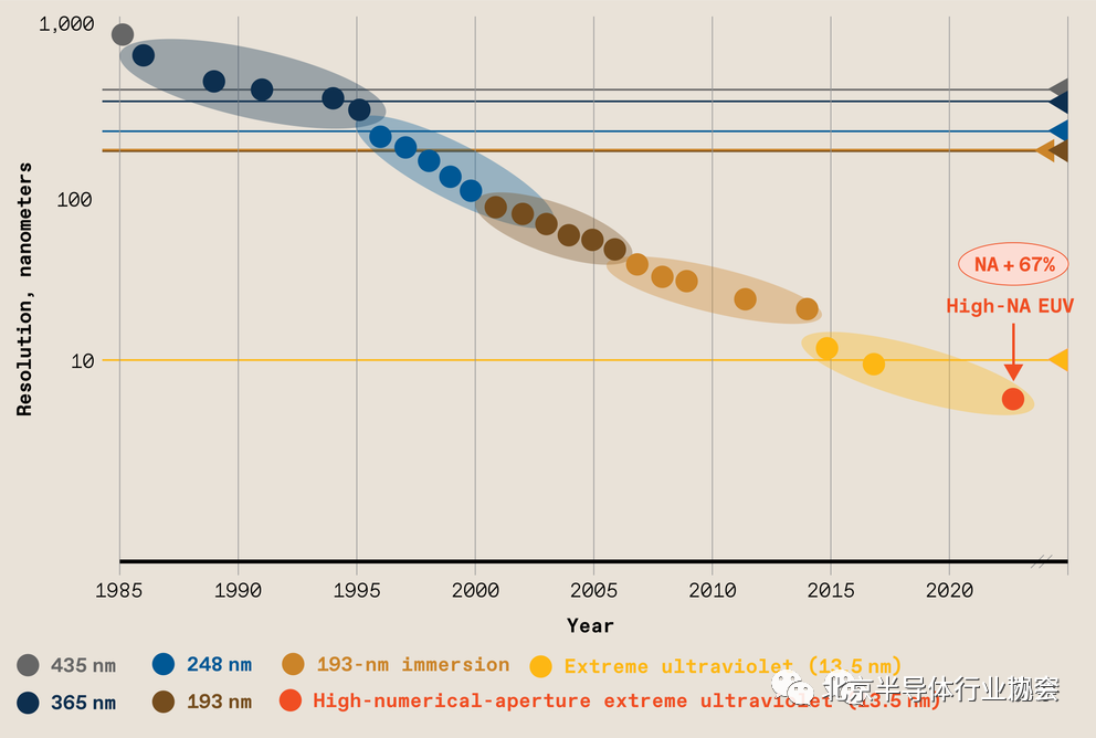 在过去四十年中,光刻技术的分辨率提高了约10,000 倍。这在一定程度上是由于使用了越来越小的光波长,但它也需要更大的数值孔径和改进的处理技术。
