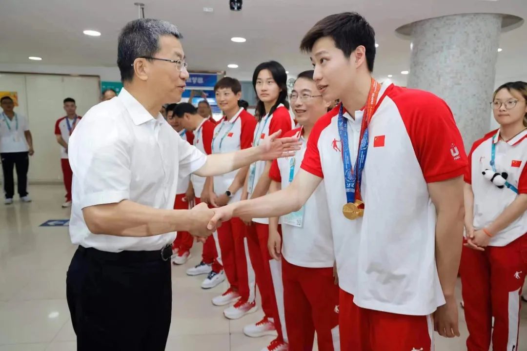赛后,教育部部长怀进鹏慰问获奖运动员代表,与3枚接力金牌获得者林涛亲切交流。