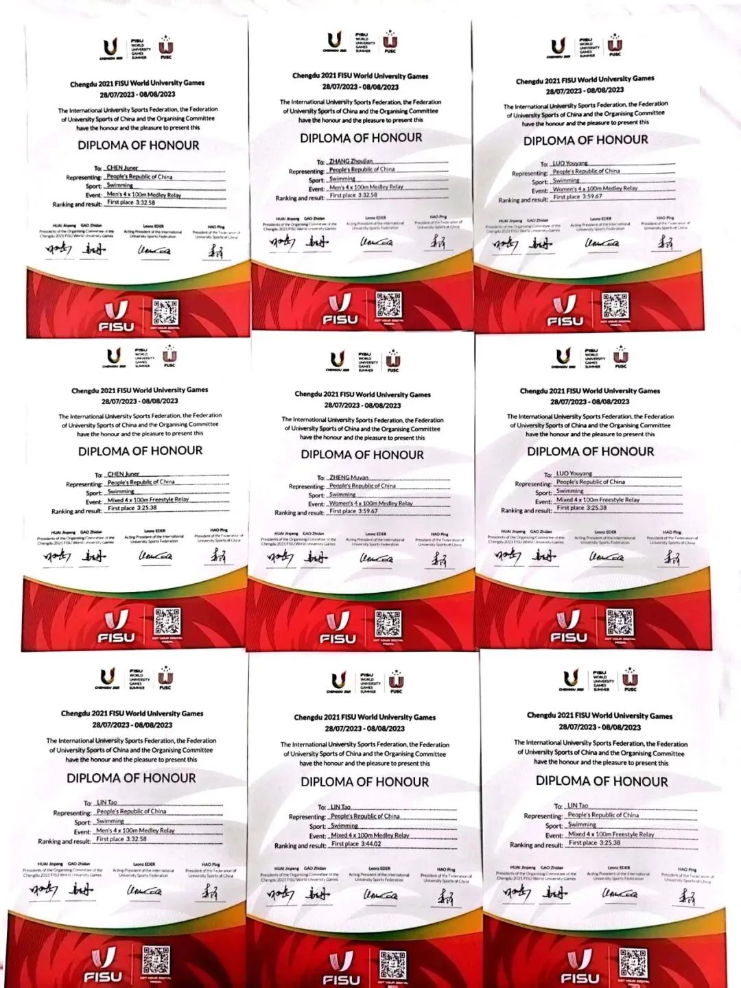 “凝心聚力,团队协作”是本次赛前训练和参赛的主体指导思想。长春集训阶段,大家同甘共苦,相互支持,运动训练专业林涛、罗敏熙、张周健、黄志伟都突破了个人历史最佳成绩,陈恩德、郑木岩也将单项能力调整到年度最佳状态。比赛中,大家分工明确,预赛决赛交替,相互鼓励,迸发出强大实力。最终,罗悠扬、林涛、陈俊儿、张周健、郑木岩成功获得世界大学生游泳冠军。