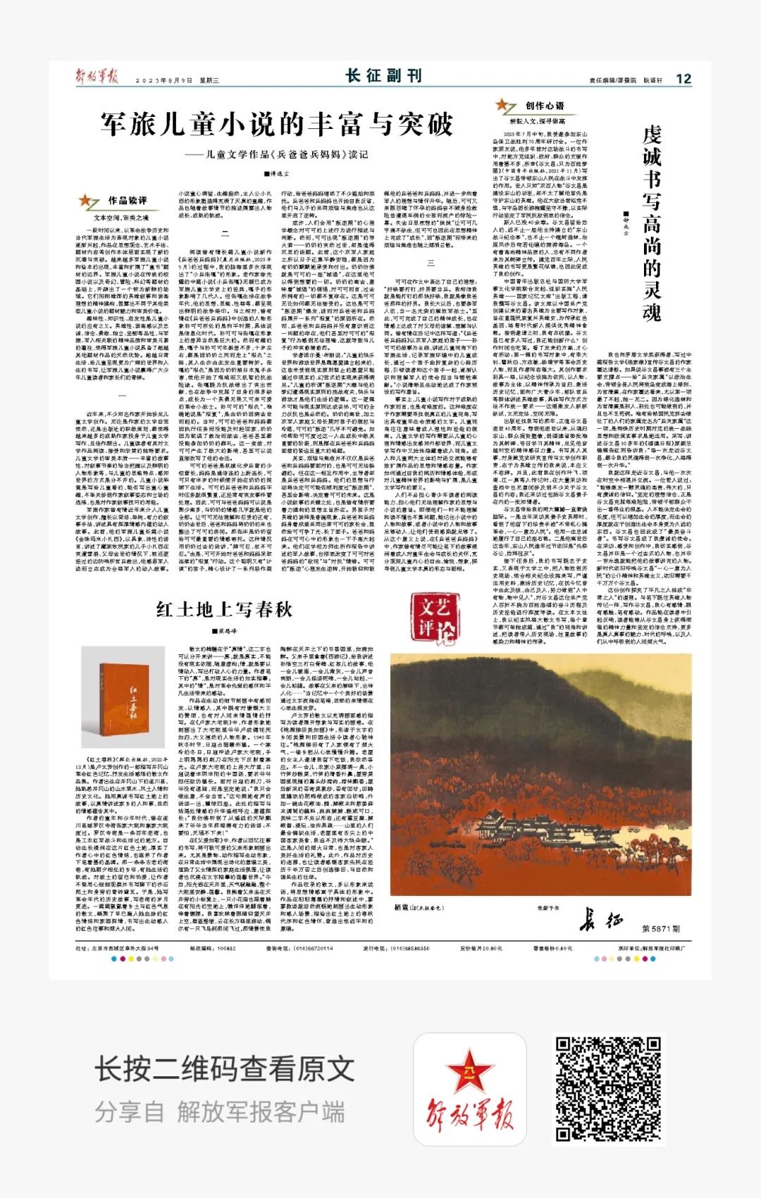 一段时间以来,以革命战争历史和当代军旅生活为表现对象的儿童小说逐渐兴起,显露出不同于其他类型儿童小说的题材魅力和审美价值。请看12版为您带来儿童文学作品《兵爸爸兵妈妈》读记《军旅儿童小说的丰富与突破》。