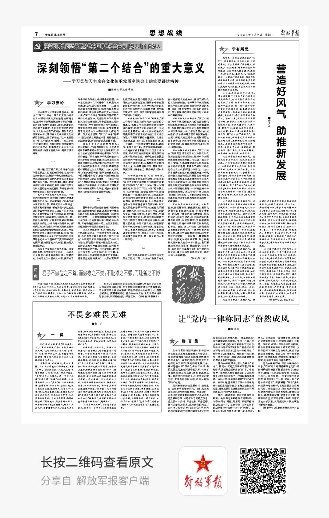 “第二个结合”在坚守马克思主义基本原理的同时,立足中华优秀传统文化又激活中华优秀传统文化,使之成为推动中国特色社会主义事业发展的强大力量。请看7版《深刻领悟“第二个结合”的重大意义——学习贯彻习主席在文化传承发展座谈会上的重要讲话精神》。