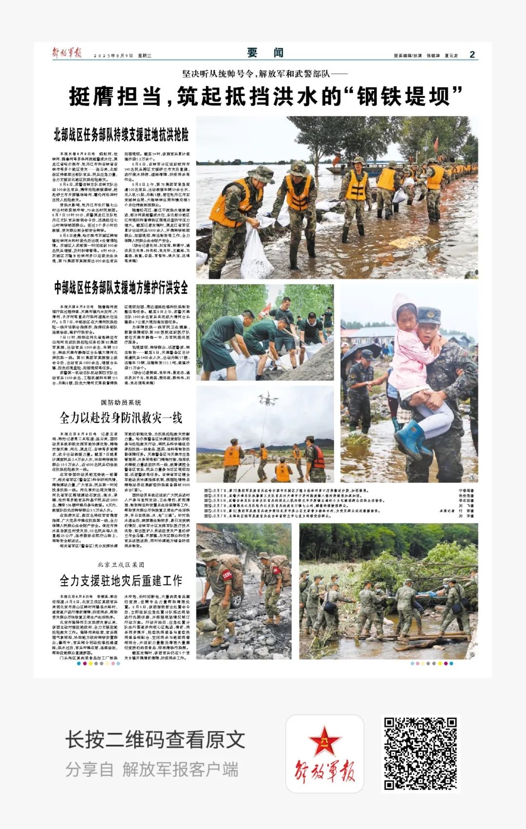 在这次抗洪抢险救灾中,哪里有灾情,官兵就出现在哪里,哪里有困难,部队就攻坚在哪里。敬请关注今日2版《坚决听从统帅号令,解放军和武警部队——挺膺担当,筑起抵挡洪水的“钢铁堤坝”》。
