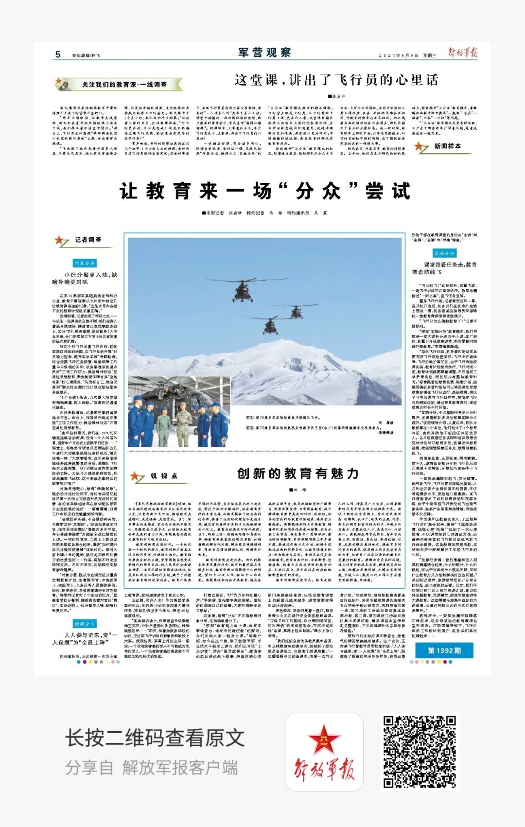 一堂精品好课,背后诸多用心。第76集团军某陆航旅探索推开“三分法”教育模式,着眼解决施教过程中要求“一般粗”、官兵“一锅煮”、内容“一刀切”等问题。这一教育模式是怎样运转的,又产生了哪些效果?阅读5版《让教育来一场“分众”尝试》一探究竟。