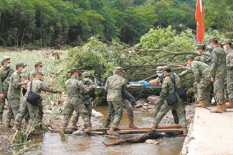 8月7日,北部战区陆军某旅官兵在吉林省舒兰市七里乡转移受伤群众。刘洋摄