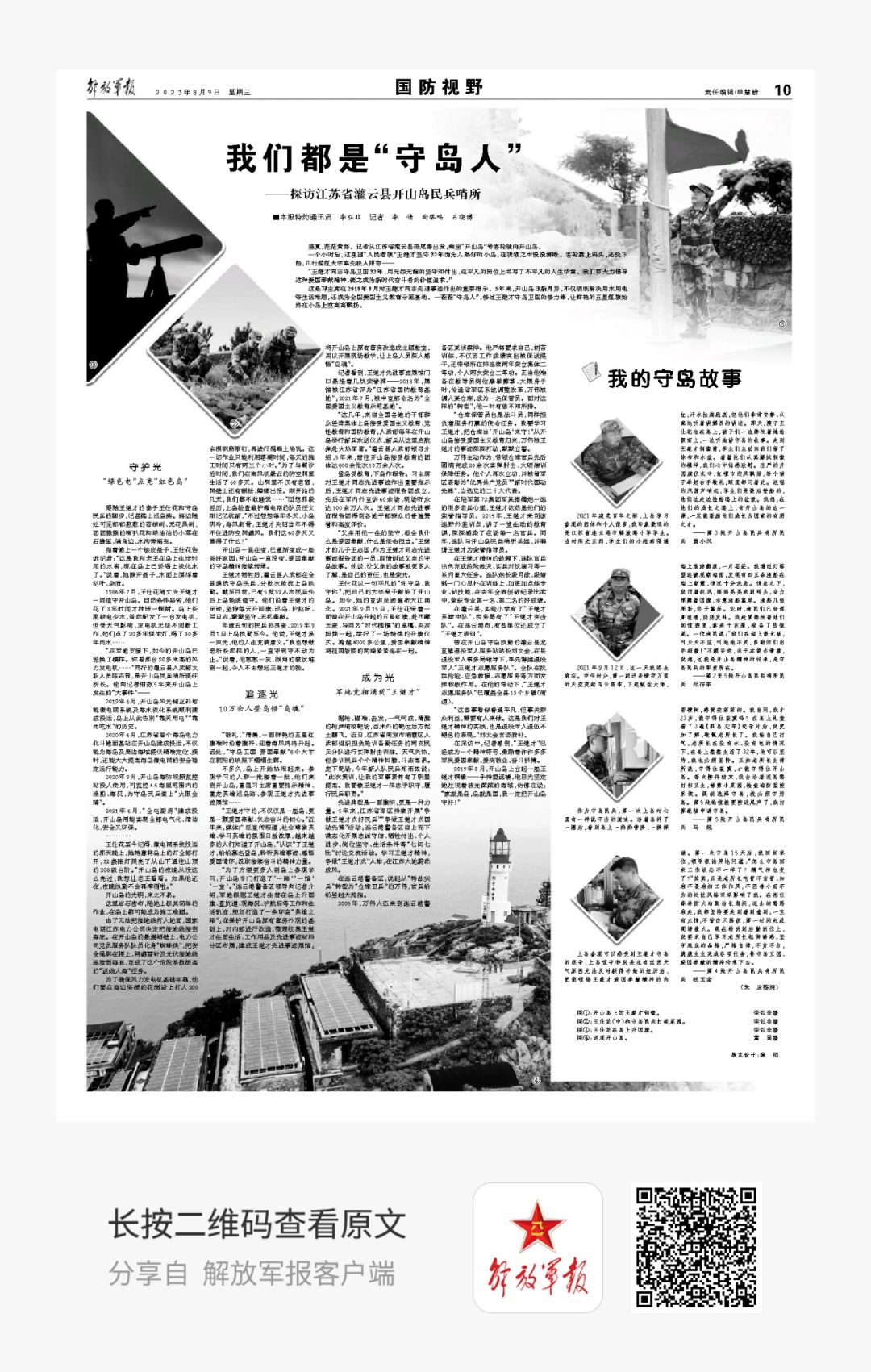 “开山岛”,因“人民楷模”王继才坚守32年而为人熟知。如今,一茬茬“守岛人”接过王继才守岛卫国的接力棒,让鲜艳的五星红旗始终在小岛上空高高飘扬。敬请阅读10版《我们都是“守岛人”》。