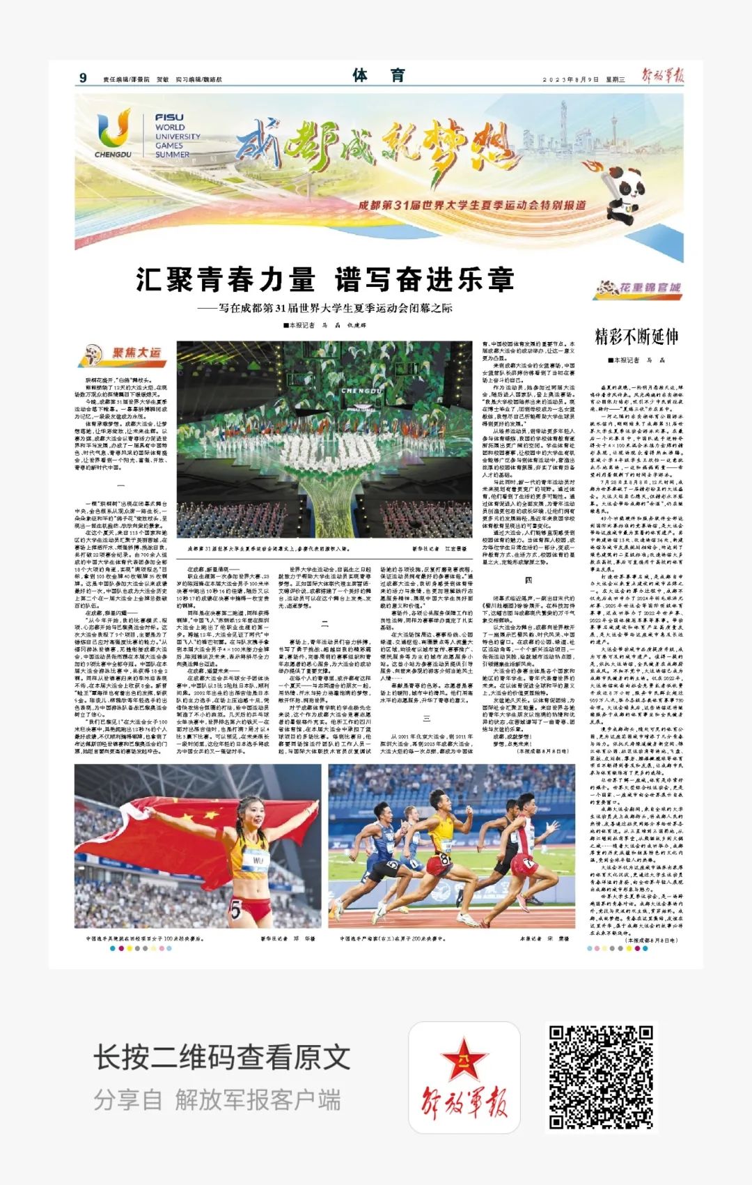 熊熊燃烧了12天的大运火炬,在现场数万观众的深情瞩目下缓缓熄灭。体育承载梦想。成都大运会,让梦想落地,让华彩绽放,让未来生辉。请看9版《汇聚青春力量 谱写奋进乐章——写在成都第31届世界大学生夏季运动会闭幕之际》。