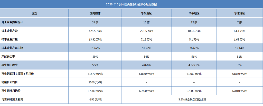 6月再生铜杆开工率及产量方面,受精废价差扩大影响,全国低氧杆产量约22.57万吨,较5月份增加4.18万吨,全国再生铜杆开工率约39.26%,环比涨幅7.26%。预计7月份受行情回暖以及精废价差回归等因素影响,产量继续增加。