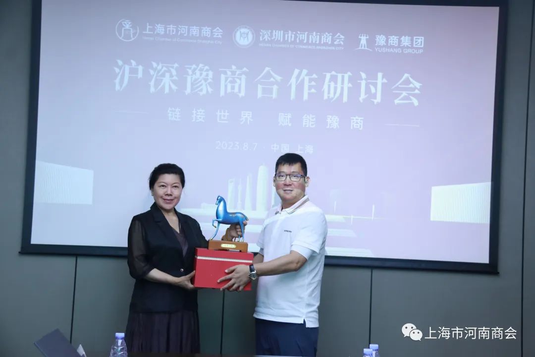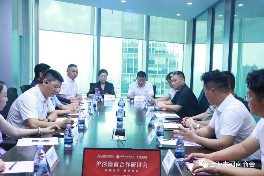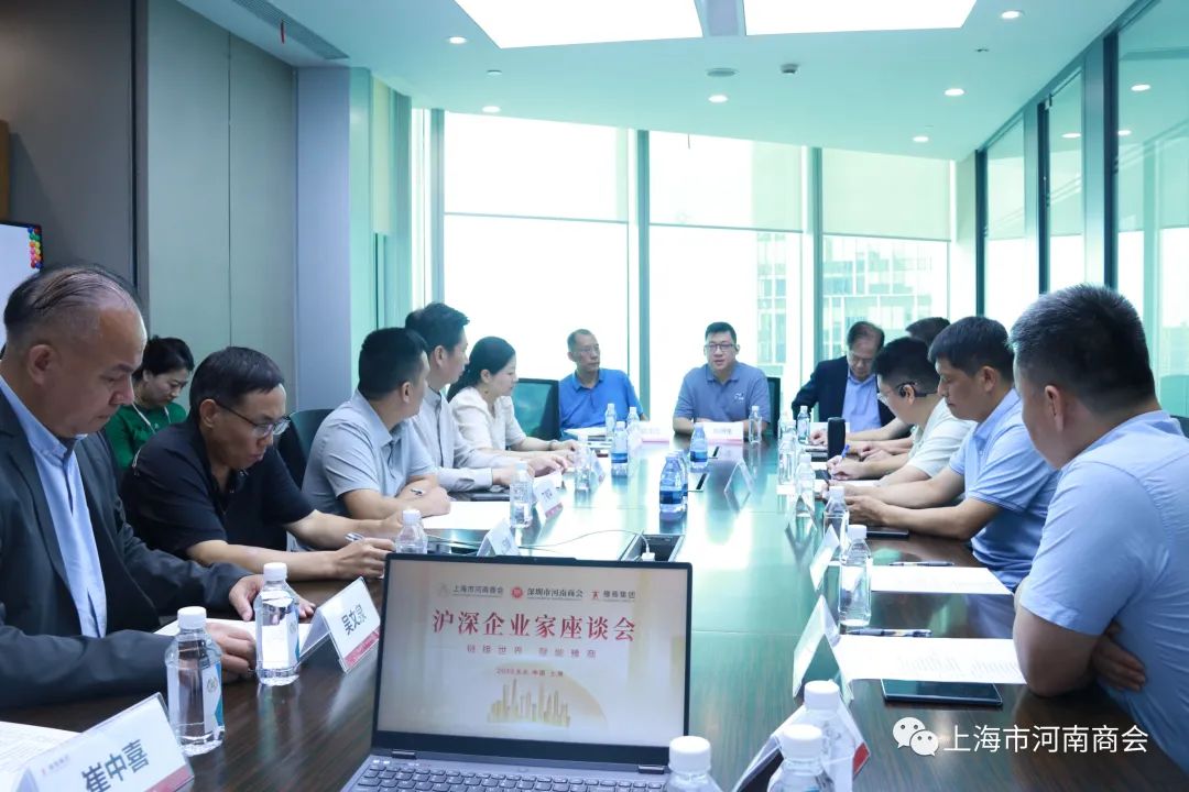 参加座谈会的有:上海市河南商会会长刘喜梅、监事长刘情义、秘书长王根成、豫商集团总经理石宝峰等,刘喜梅会长代表上海市河南商会和创会会长韩宏伟对深圳河南商会荆会长一行表示热烈的欢迎。炎炎夏日各位企业家不远千里来到上海传经送宝。对我们上海河南商会来说是莫大的鼓舞。大家交流办会经验。资源共享。实现合作共赢。同时也祝各位在沪期间心情愉快。注意防暑降温。身体健康。深圳市河南商会会长荆新生讲话说,首先对上海市河南商会和豫商集团的热情接待表示感谢,接着对深圳市河南商会进行了简单介绍。深圳市河南商会自2011年成立以来一直致力于凝聚在深工作生活的河南籍人士,发挥商会作为政府和企业之间的桥梁作用,以“团结共进、合作共赢”为宗旨,协调各方关系,团结在深豫商,为深圳经济社会发展做出新贡献。此次来沪调研学习,学校上海开放的思想和国际化视野,并借此诚挚邀请在座各位上海企业家朋友到深圳省河南商会考察交流。接下来,上海市河南商会秘书长王根成介绍了商会的发展概况。豫商集团总经理石宝峰就豫商集团的发展现状做出了简要的分析,并详细介绍了豫商事业联合体的模式。参会的企业家每人都做了介绍,现场气氛热烈,发言真知灼见,高屋建瓴,充分展示了沪深企业家的社会责任感和凝聚力。深圳市河南商会会长向上海市河南商会会长赠送了礼物。双方签订了友好商会合作协议。8日上午,召开了沪深企业座谈会,上海市河南商会副会长、上海天演建筑物移位工程股份有限公司董事长蓝戊己、上海市河南商会秘书长王根成、上海新时达机器人有限公司副总经理张友峰、豫商集团总经理石宝峰、深圳市河南商会会长荆新生一行以及大爱无疆读书会会长黄传雄、上海康居人家科技有限公司董事长丁帮平、上海中龙护嘉集团执行董事、苏州市姑苏区台商协会副会长吴文泉、宇培集团副总经理崔中喜、上海君维士管理咨询有限公司总经理虞勤、杭州越圣网络科技有限公司总经理侯宜均等企业家参加了座谈会。下午深圳市河南商会一行来到全国各省、市商会办公中心参观。并在上海市河南商会会议室座谈交流。通过本次两会的交流,增进了兄弟商会之间的联络和资源共享,相互学习,共同成长。跨越千里,共商沪深豫商发展大计,共同推动两会企业家事业繁荣发展。