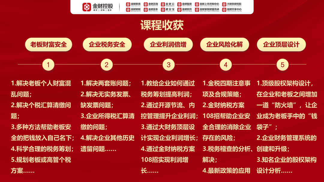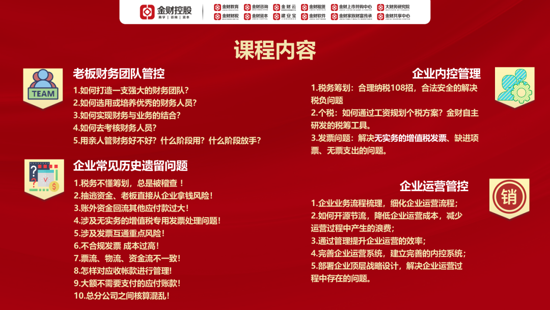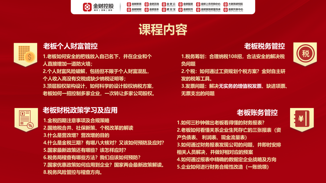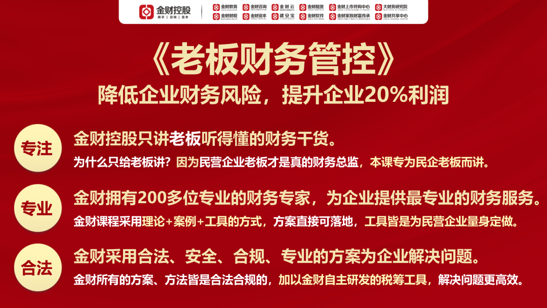欢迎走进金财控股8月17-18日在北京举办的《老板财务管控》,做一名懂财税的老板!
