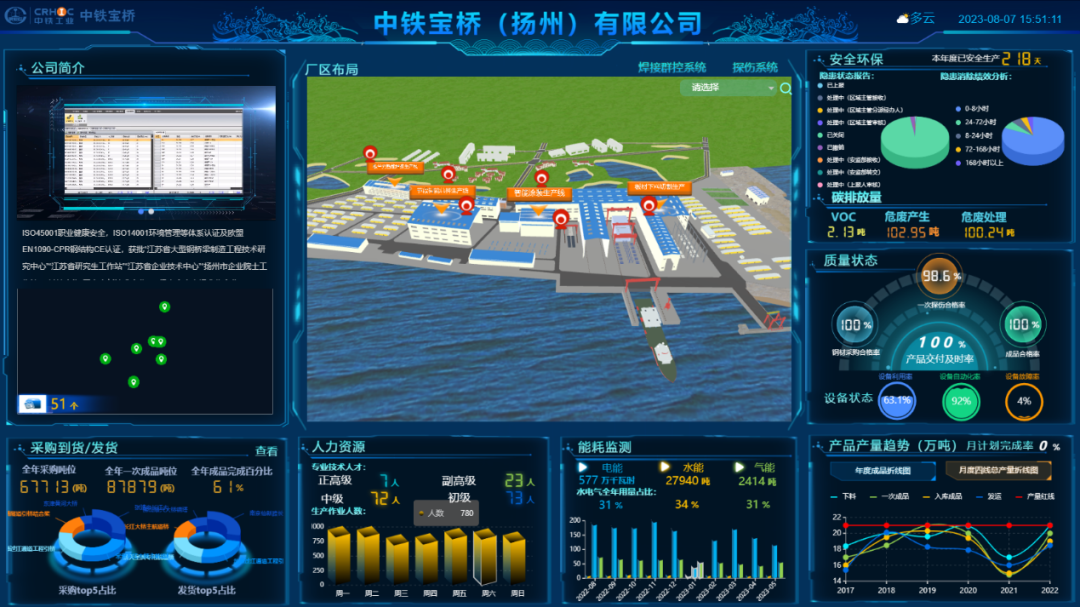 中铁宝桥扬州公司通过应用智能制造信息系统与钢桥梁智能生产设备结合的方式,建设数据池与统一编码管理系统、PLM系统、ERP系统、MES系统、WMS系统及数字化产线,打造了“钢桥梁智能制造信息管理平台”,打通研发设计、计划排产、生产制造、供应链协同等全流程业务链条,实现从设计到生产的全过程信息化、数据化管理。