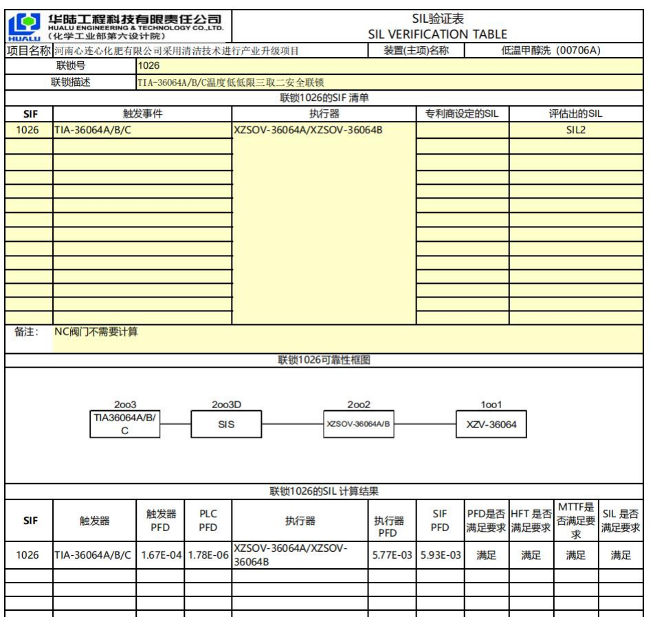 安全仪表系统设计、采购完成后,由有资质的单位编制《安全仪表系统安全完整性(SIL)验算报告》。SL安全完整性等级的验证,应当根据SL安全完整性定级即LOPA报告的每个SIF回路的各个组成部分的PFD(要求时的失效概率) ,计算回路整体要求时的失效概率,计算应充分考虑SIF回路的硬件结构约束特性 (HFT)、SIS系统能力 (SC),确认SIF回路能否达到所需的SIL等级要求。