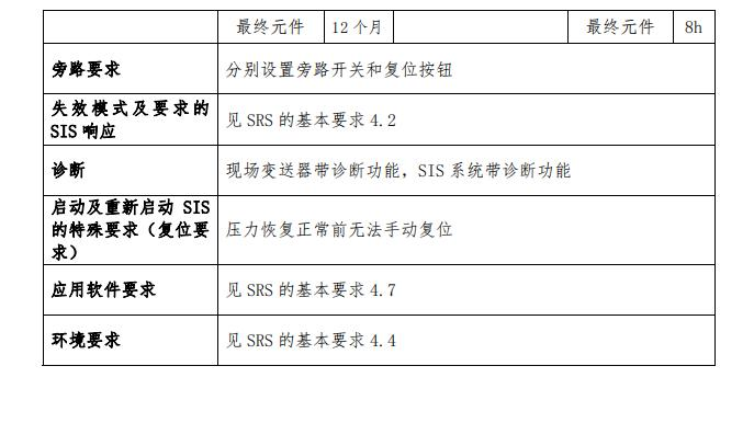 包括: 联锁保护要求、安全功能时间要求、检测和执行元件的冗余结构要求、自诊断要求及旁路要求等内容,SRS是 SIS 设计和运行维护各组织工作的基础和依据。