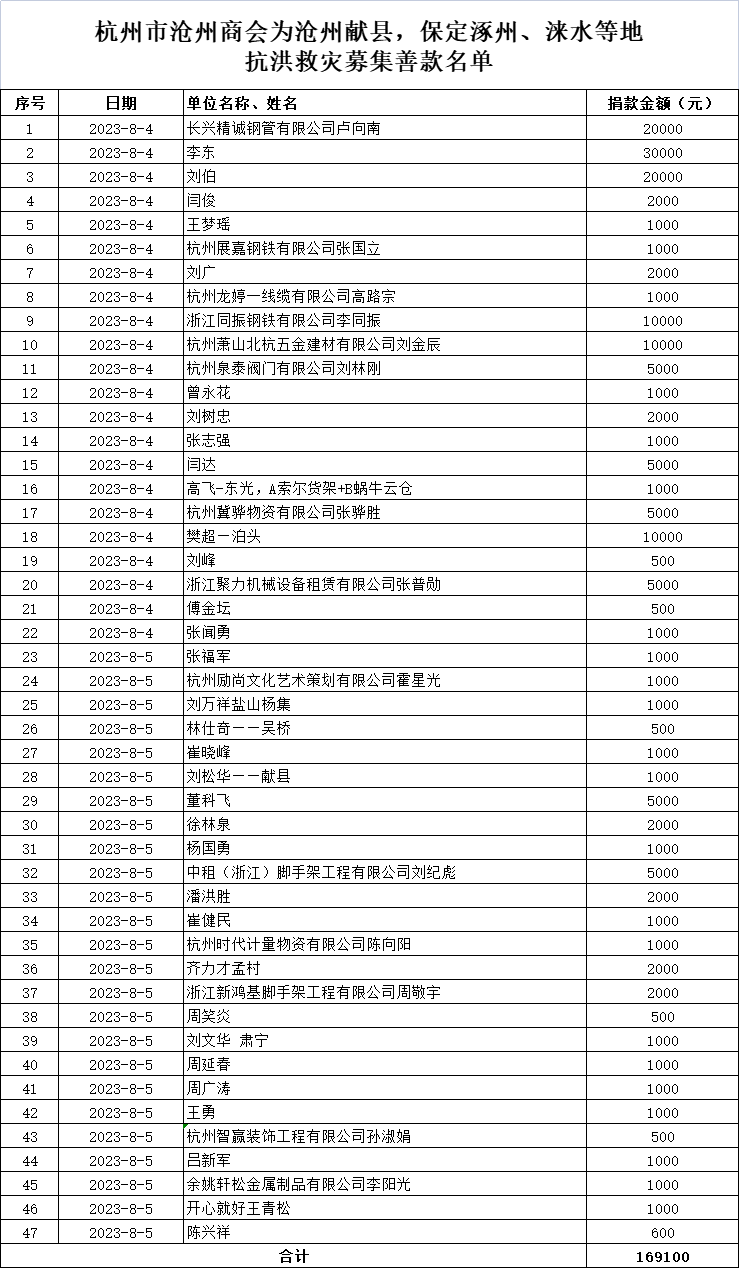 天灾无情、大爱无价,多方支援、共克时艰!连日来,商会广大会员、在外乡贤、社会各界爱心人士纷纷踊跃捐款,助力抗灾救灾,帮助家乡受灾群众重建家园,用实际行动传递温暖和希望。在此,杭州市沧州商会向参与救灾募捐的各位会员、各位老乡和社会各界朋友,表示衷心的感谢,并致以崇高的敬意!