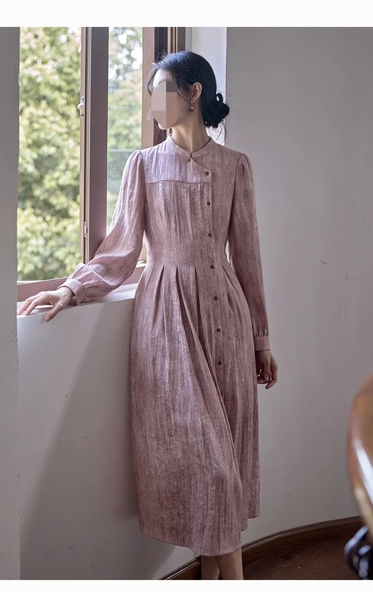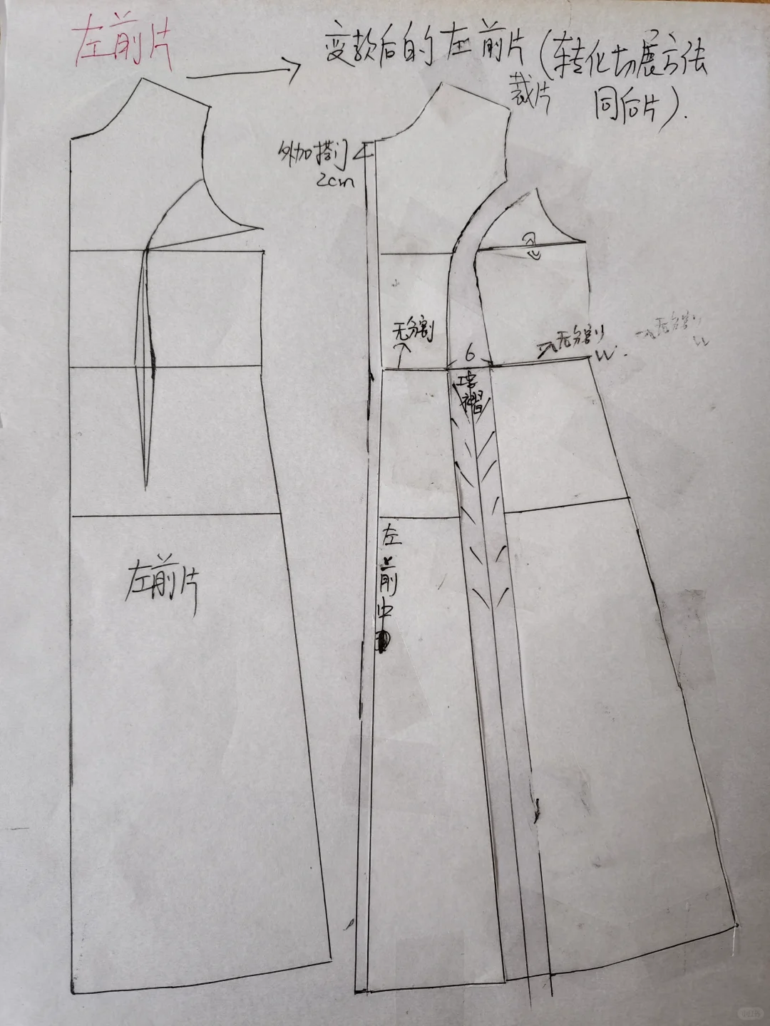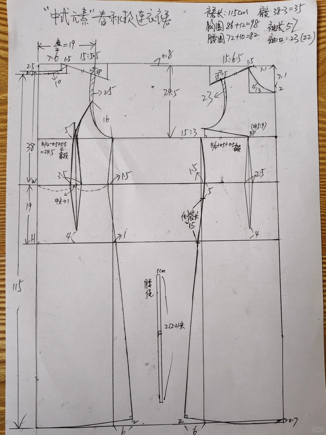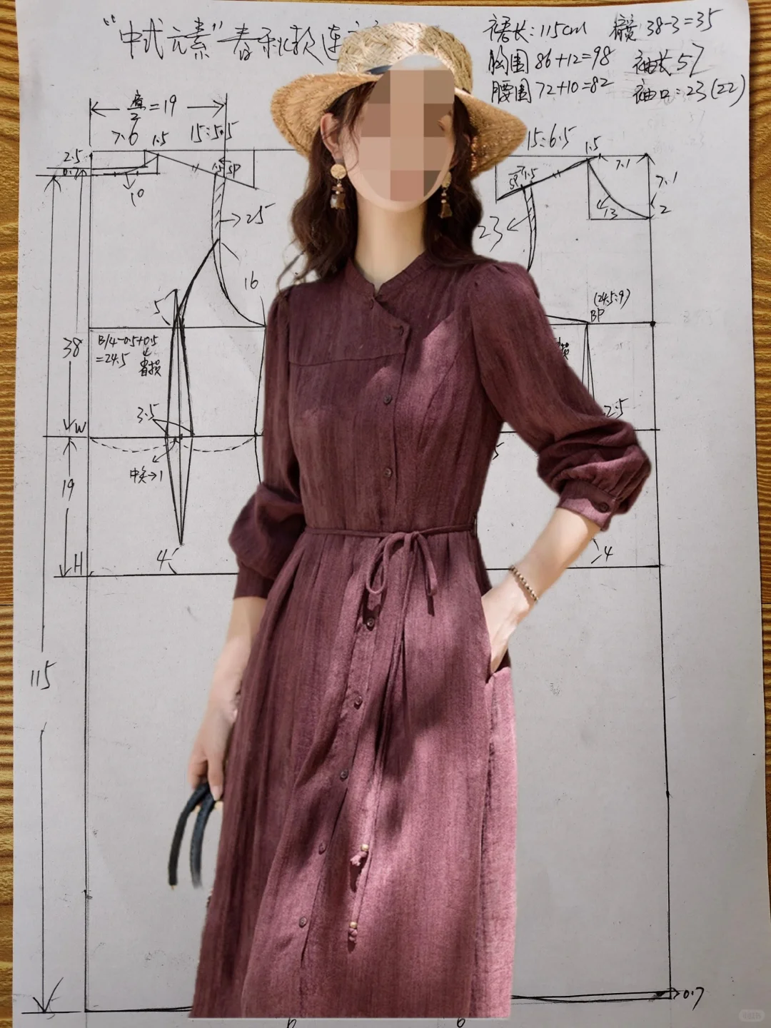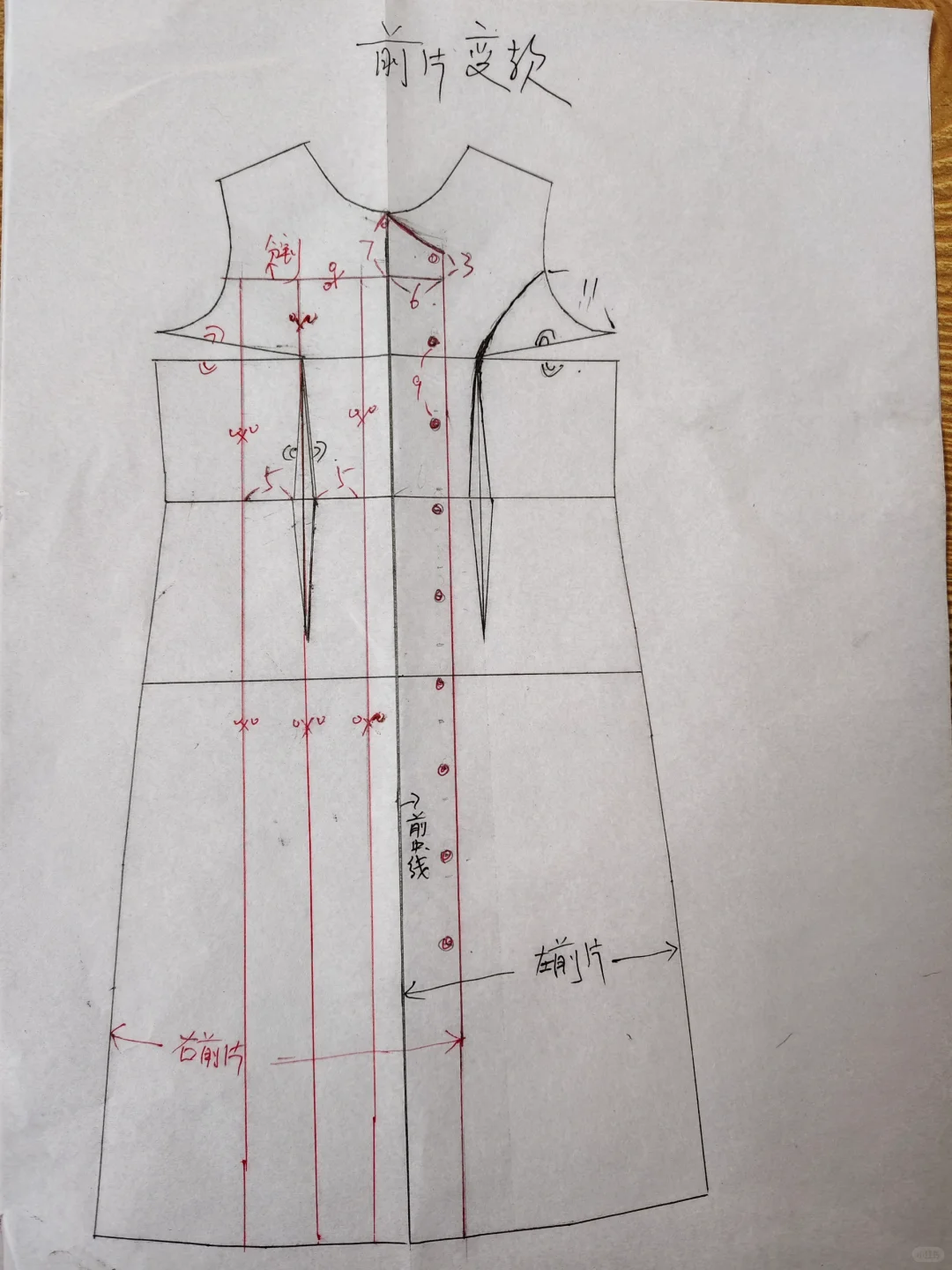 #我的手工日常 版型特征:中式元素西式结构,长款连衣裙,胸围偏合体,腰部偏宽松,系腰绳调节腰线,中式小立领,前后片均非断腰节,后片刀背缝,后腰下裙切展加入工字褶,后中不破逢,前片左右不对称,右压左,小偏襟,10粒纽扣开合,左前刀背缝,腰部插入工字褶,右前上下分割,右下三条纵向分割线省道合并,腰部插入三个工字褶,变款后下摆围达2米多,袖子为灯笼袖,袖口抽碎褶。整体效果:西式结构凸显身材,中式元素复古沉稳,优雅端庄且赋予文艺气息,是春秋必备裙装,旅行,日常通勤皆宜。适合面料:亚麻混纺,也可春秋款裙装梭织面料。#服装设计 #裁剪图 #服装打版 #服装裁剪 #中式穿搭 #服装与服饰 #复古连衣裙 #连衣裙 #做衣服