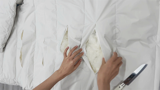 为了更直观的给大家测试羽绒品质和蓬松度,还做了个大胆测试:直接把羽绒服划开!