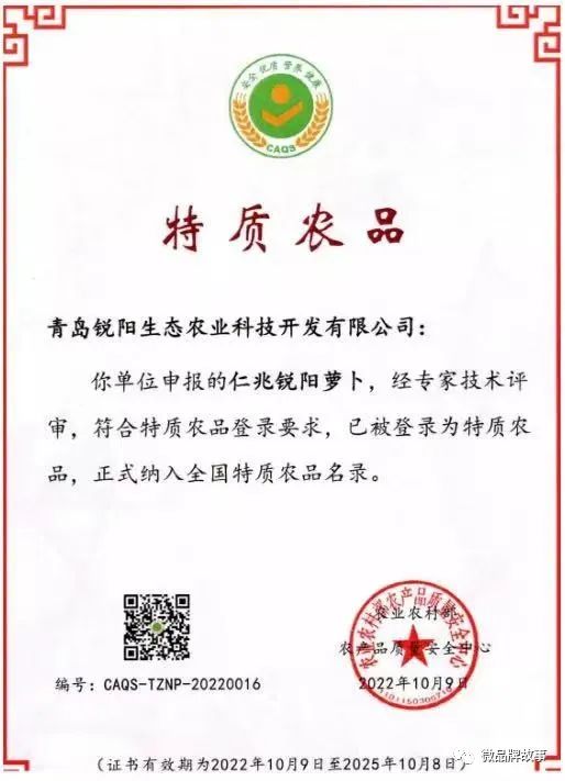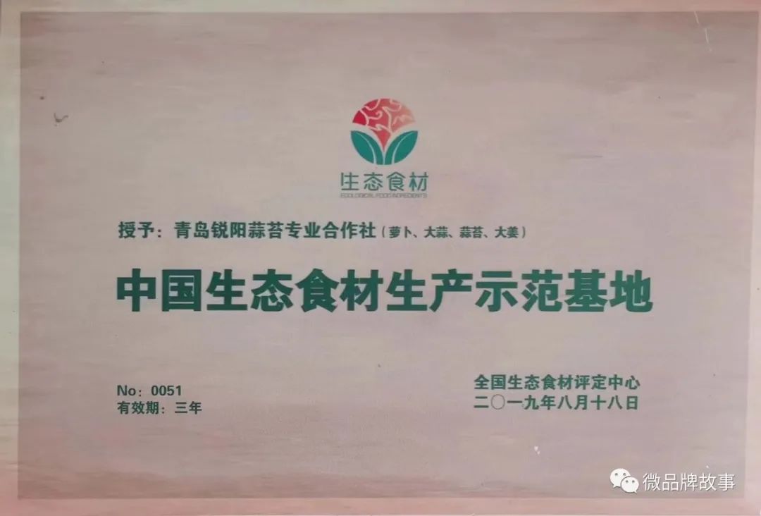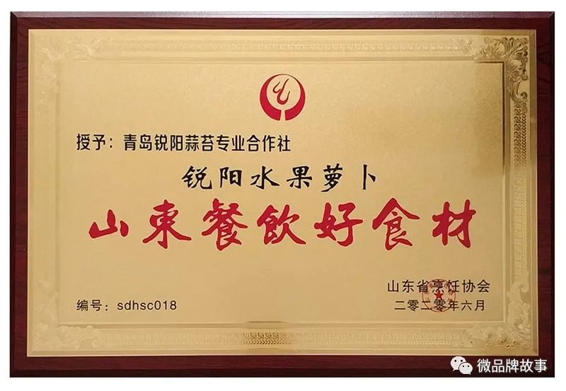 2018年获得“上海合作组织青岛峰会农产品专供基地”荣誉称号:2019年2月,被上海市商务委认定青岛市唯一“上海市外延蔬菜生产基地”,合作社基地实现全程可视化、可追溯。2019年8月,被全国生态食材评定中心授予“中国生态食材生产示范基地”。锐阳水果萝卜,于 2019年12月参加中国绿色食品博览会喜获“金奖”,2020年3月,锐阳水果萝卜,因出色品质被评为“山东名牌”,2020年6月,合作社的“仁兆蒜苔”和“锐阳水果萝卜”,被山东烹饪协会授予“山东餐饮好食材”。2021年,“锐阳水果萝卜”获评第十四届Fresh亚洲果蔬产业博览会。2021年,“锐阳水果萝卜”获评潍县萝卜品质提升大赛金质奖。2022年,“锐阳水果萝卜”被农业农村部农产品质量安全中心评定为“名特优新农产品”、“特质农品”。
