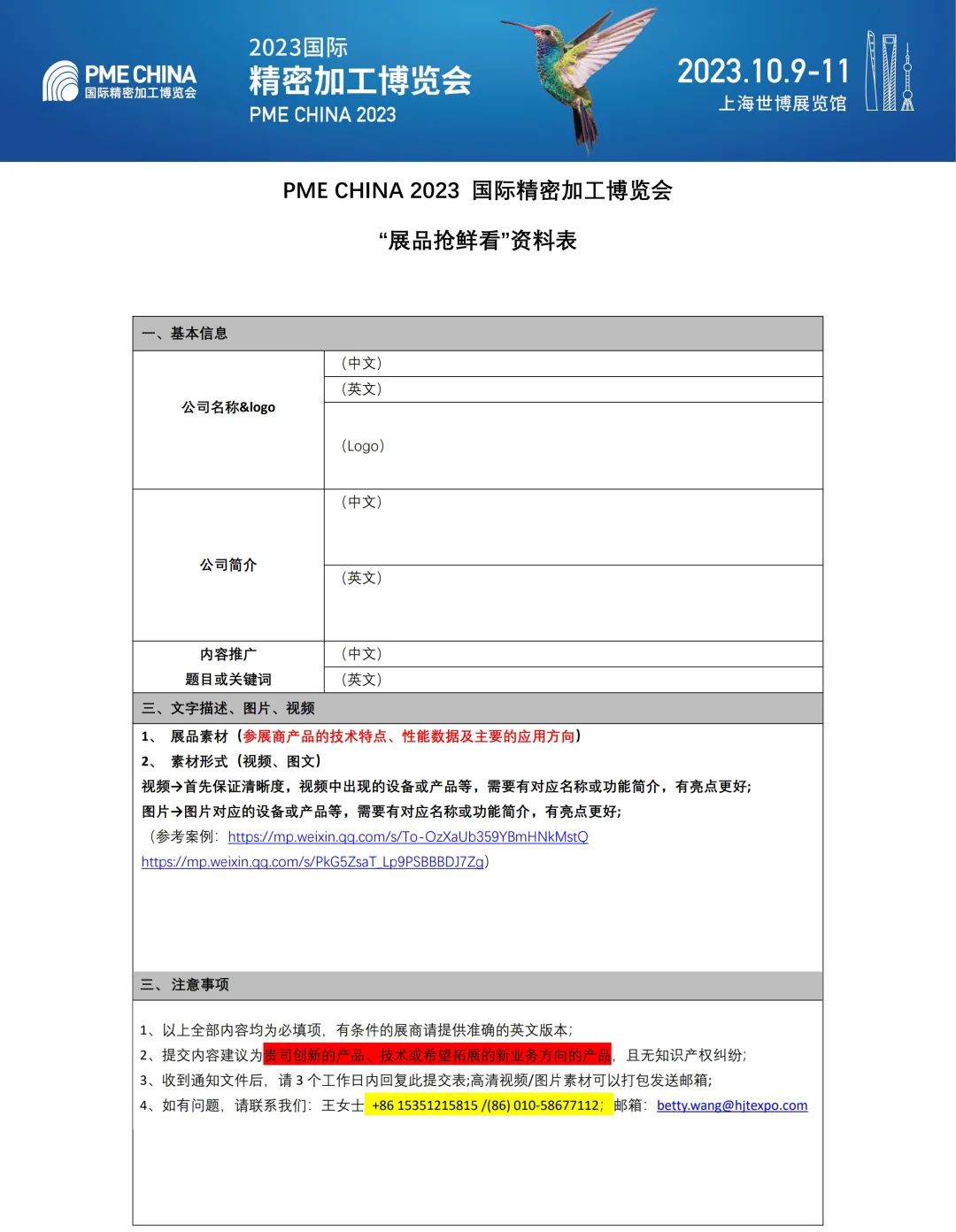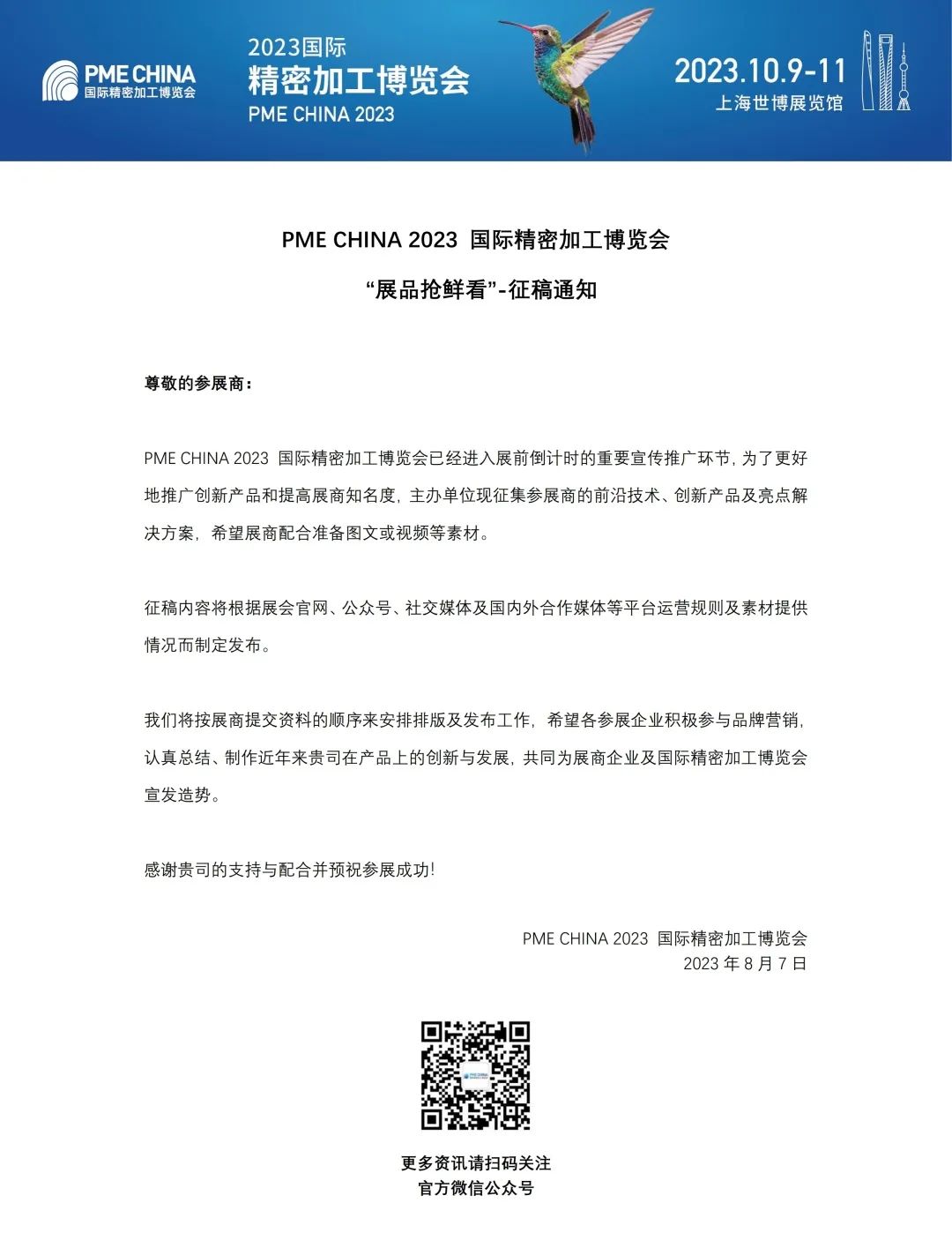 PME CHINA 2023 国际精密加工博览会已经进入展前倒计时的重要宣传推广环节,为了更好地推广创新产品和提高展商知名度,主办单位现征集参展商的前沿技术、创新产品及亮点解决方案,希望展商配合准备图文或视频等素材。