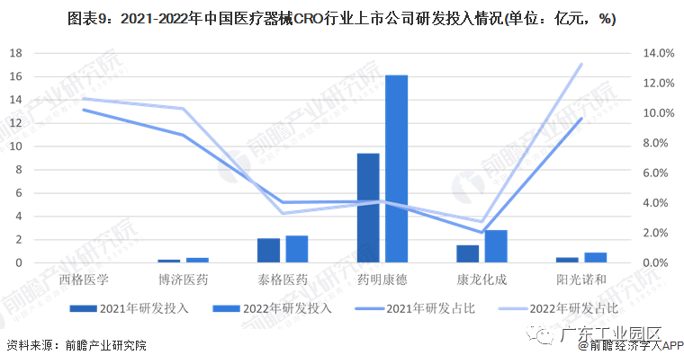 从中国医疗器械CRO行业上市企业的研发投入来看,2021-2022年,研发投入最多的是药明康德;研发投入占比最高的是西格医学和阳光诺和。