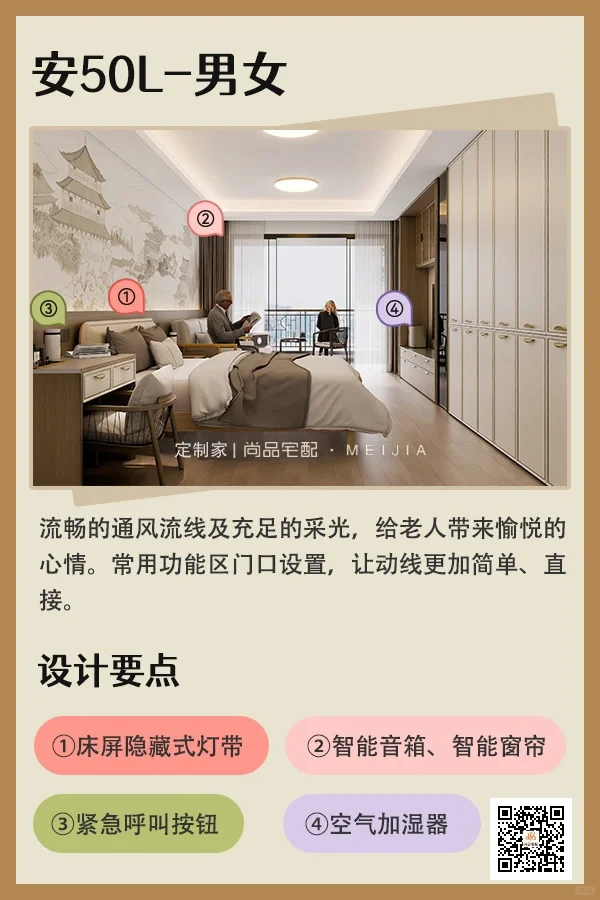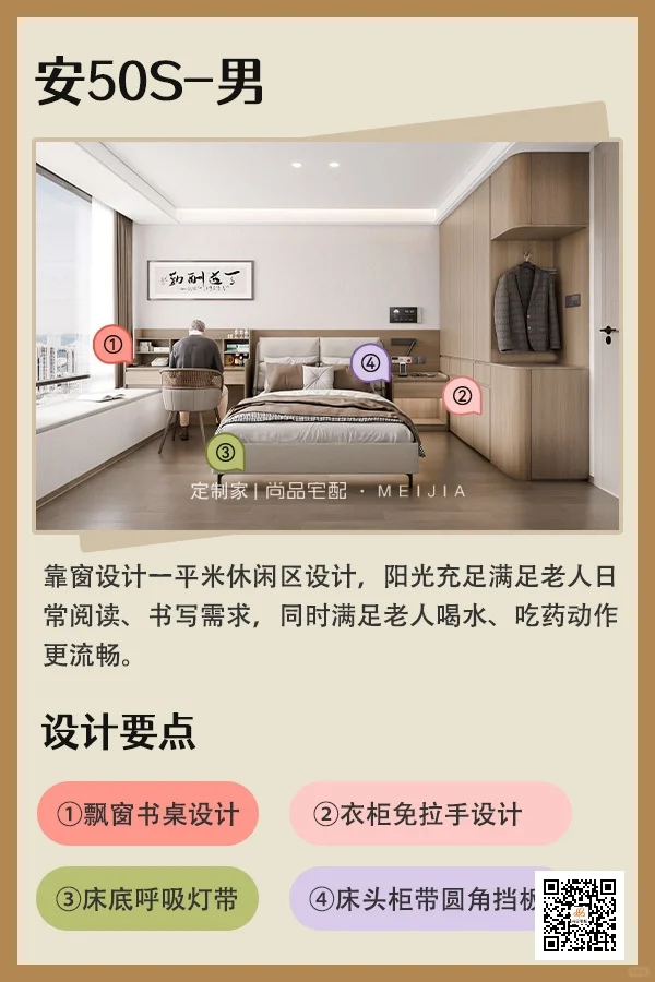 ✨ 卧室是我们每天休息的地方,年长者更是对舒适度有着更高的要求。将卧室的设计理念融入到了每一寸空间中,无论是床的选择还是床尾柜的设计,都力求让年长者的居住体验更加便利。