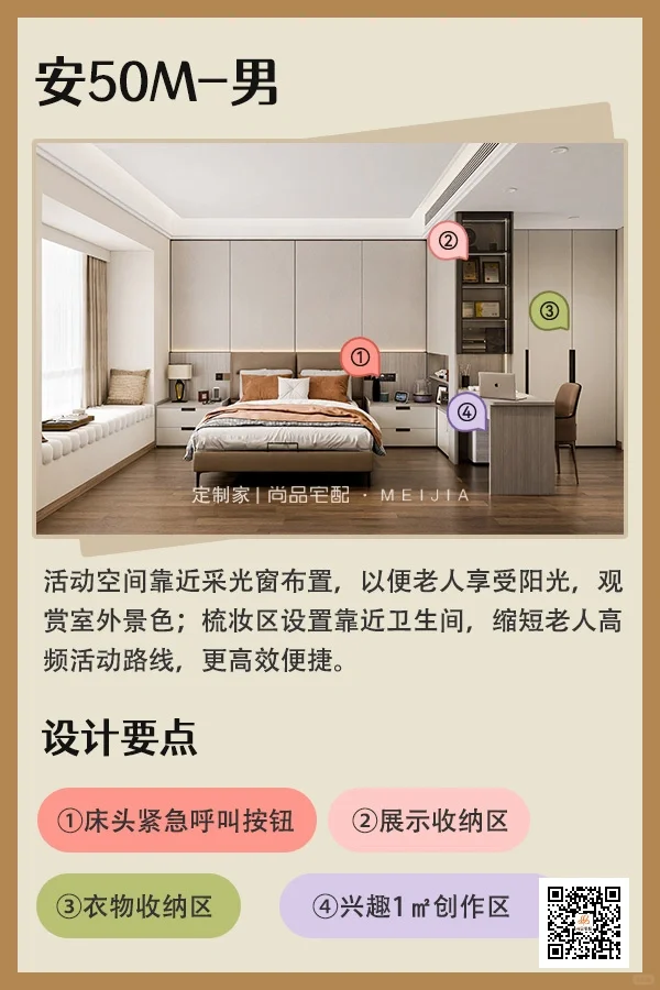 ? 总的来说,对于长辈房设计有着深入的思考和理解。在每个细节中都融入了独特的个性和专业知识,为年长者营造了一个温馨舒适、贴心呵护的家。无论是在床的舒适度还是储物的便利性上,都让家人感受到对待家的用心和专业。
