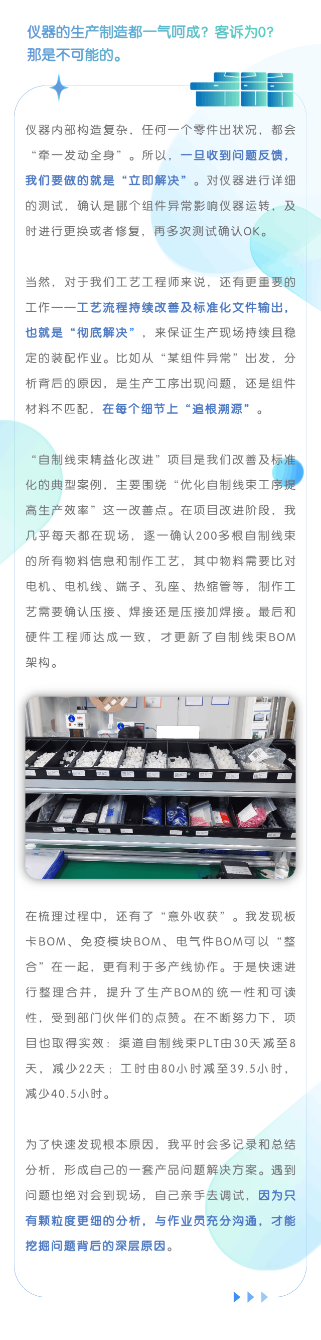 以客户为中心,聚焦产品质量、成本、交付等核心业务降本增效,是复星诊断精益制造的“宗旨”。实施精益制造是决心追求完美的历程,也是追求卓越的过程,它是产品质量的重要保障,更是为客户创造价值的工作。这次,诊断君邀请了来自复星诊断仪器制造部门的3位同学,他们从仪器工艺、精益管理、制程管理等角度,为我们分享在仪器生产制造过程中“精益求精”的故事。精益求精,不是一句简单的口号,它需要团队的充分理解和坚持践行。在产品不断更新迭代的路上,我们始终坚持高标准、严要求、一丝不苟,将仪器生产安全、质量、交付、成本控制负责到底,为客户提供更优质可及的诊断产品和服务。#福利时刻#留言说说你最近认真钻研的一件事顺便聊聊如何认真投入我们将根据留言精彩度、点赞量、互动性综合选出五位朋友赠送“竖纹玻璃马克杯 ”推荐阅读诊断仁儿plog丨传说中的“试剂生产”,是什么样的存在?原来如此!揭秘复星诊断仪器研发人“那些事儿”多图预警!复星诊断的研发人每天在做什么