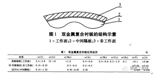 双金属复合衬板的结构示意见下图1,工作面采用高铬铸铁,非工作面采用优质碳钢,中间隔板采用低碳钢.化学成分如下(表1):