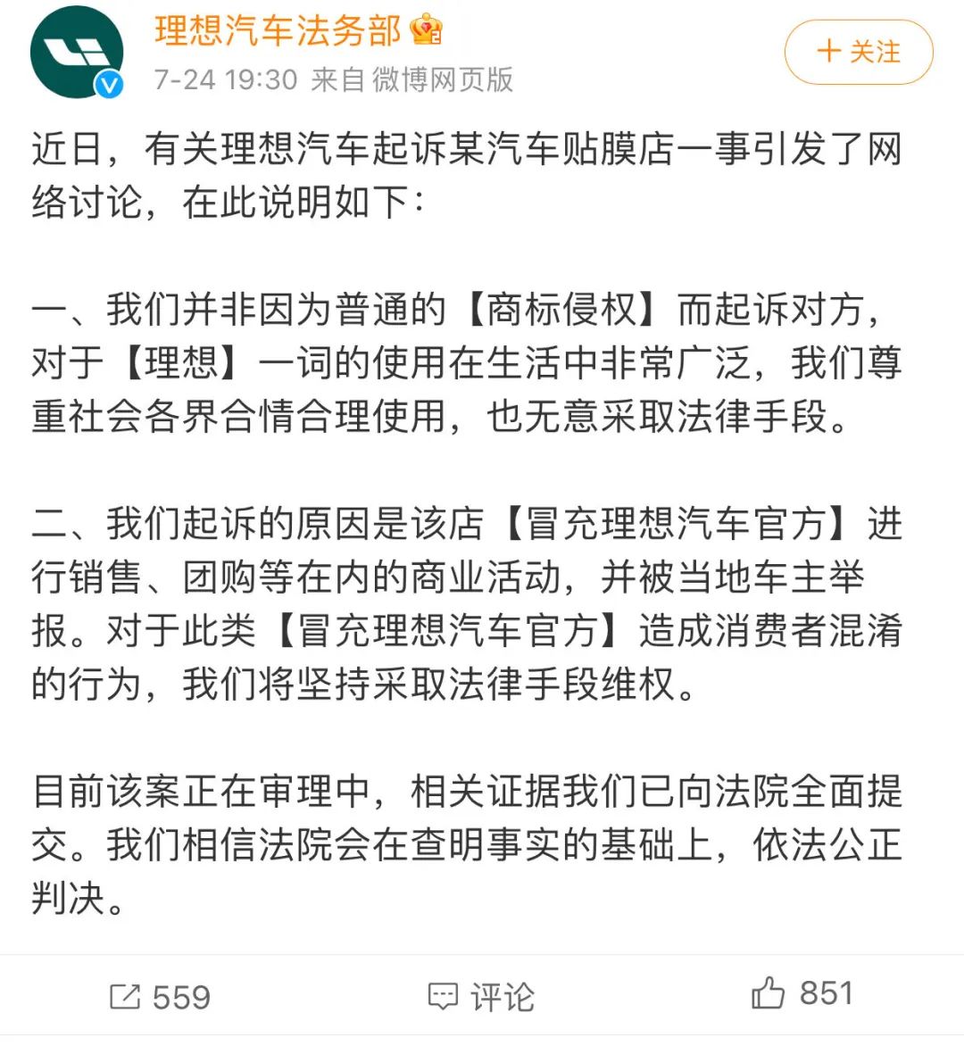 从理想汽车法务部官微的声明来看,他们并未因为普通的商标侵权而起诉对方,主要是该店冒充理想官方进行销售、团购等商业活动,并被当地车主举报。