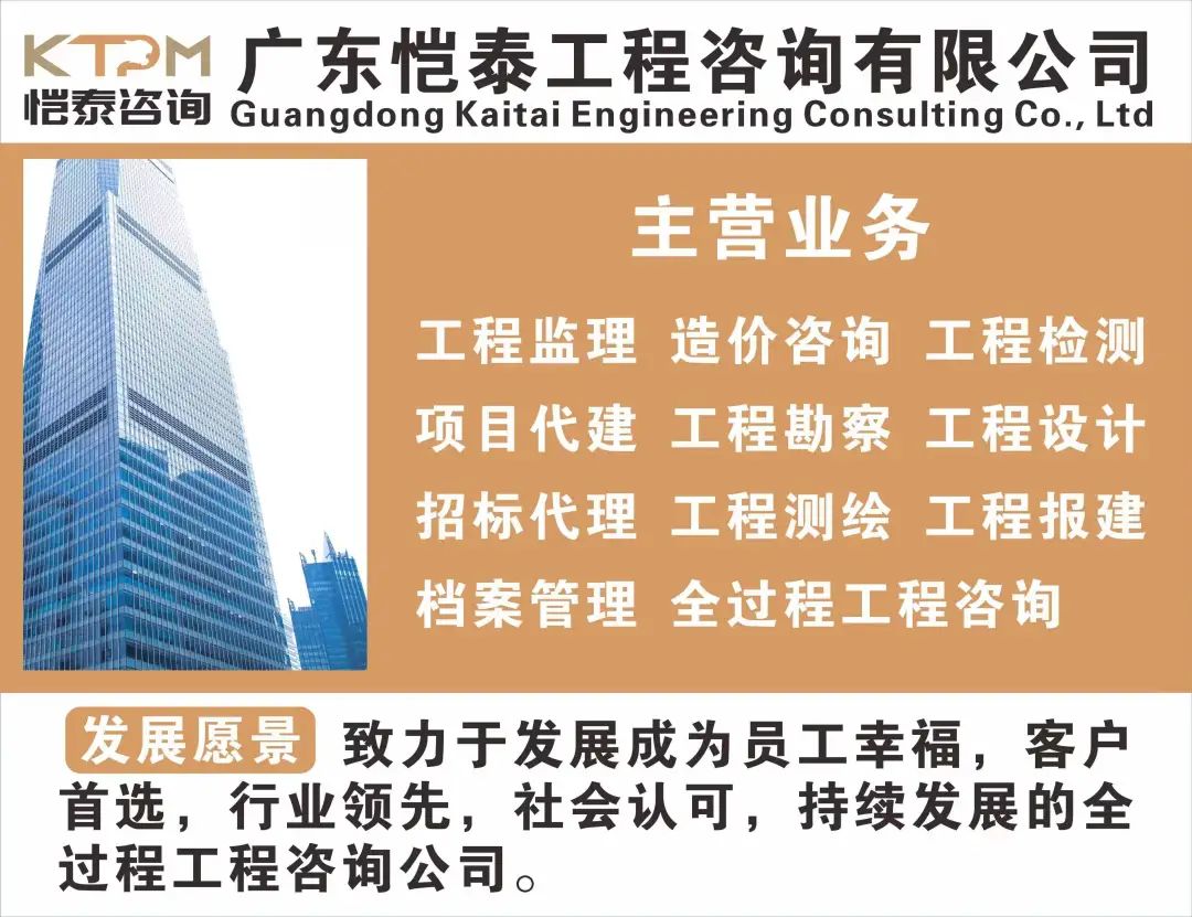 公司简介:广东恺泰工程咨询有限公司成立于2022年,是一家专业从事工程监理、造价咨询、项目代建、工程检测、工程设计、全过程工程咨询等业务的工程建设管理综合型企业,致力于为客户提供全方位、全过程的“一站式”项目管理及全过程工程咨询服务。公司经营以惠州为中心,向深圳、东莞、广州、河源及全国各地区发展。广东恺泰工程咨询有限公司聚集了大批行业精英,拥有注册结构工程师、注册建筑师、注册岩土工程师、注册建造师、注册造价工程师、注册监理工程师、注册安全工程师等专业人员配置齐全,参与完成了多个房地产、工业厂房、公共建筑、市政基础设施等类型项目建设管理咨询服务,获得了业界及客户的高度认可。秉承“为客户想得更多,为客户做得更好”与“生产带动经营,口碑赢得市场”的经营理念,通过专业、规范、高效的管理,确保客户得到最优的服务和最佳解决方案。为有志于城市建设发展相关领域的专业人士提供能够实现自我价值的工作及创业发展平台,致力于发展成为员工幸福,客户首选,行业领先,社会认可,持续发展的全过程工程咨询公司。