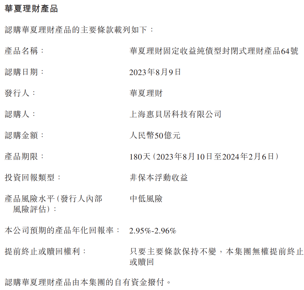 金融虎讯 8月9日消息,贝壳控股(HK:02423)宣布,于2023年8月9日,公司通过其全资附属公司上海惠贝居科技有限公司认购华夏理财产品,即华夏理财固定收益纯债型封闭式理财产品64号,本金为人民币50亿元。据介绍,该理财产品期限为180天(2023年8月10日至2024年2月6日),公司预期的产品年化回报率为2.95%-2.96%。