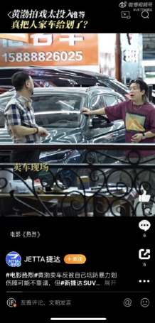 2023年7月28日,由捷达品牌赞助,捷达品牌代言人黄渤主演的电影《热烈》在全国正式上映,讲述了一位由黄渤扮演的街舞老炮儿丁雷教练偶然遇到追梦少年陈烁后,并邀请其加入自己经营的舞团——惊叹号,两人共同勇敢追梦的青春励志故事。在电影中,捷达品牌与黄渤一起热烈追梦,点燃夏日热情。