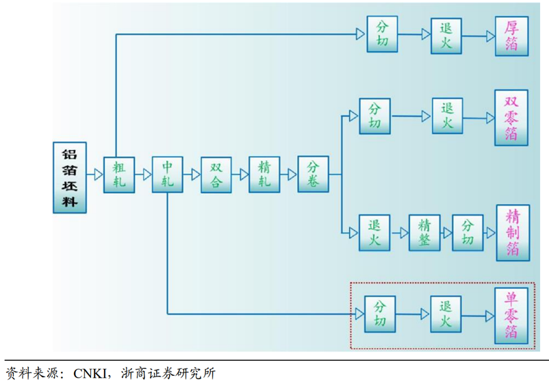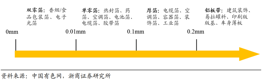 按照厚度划分,铝箔可分为双零箔、单零箔和厚箔。双零箔是指在其厚度以mm 为计量单位时小数点后有两个零的箔(即厚度<0.01mm);同理,单零箔是指以 mm为计量单位时小数点后有一个零的箔(0.01mm≤厚度<0.1mm);厚箔是指厚度介于0.1mm 到 0.2mm 之间的铝箔。