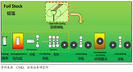 与铸锭热轧法相比,铸轧法生产铝箔坯料的工艺流程相对较为简单;不需要经过熔炼铸锭、铣面、均匀化和热轧等复杂的工艺步骤,而是将铝熔体直接倒入两个旋转的铸轧辊(结晶器),在铸轧区 2~3s 时间内同时完成凝固和热轧两个过程,获得厚度为 4~7mm 的板材。类似于热轧铝箔坯料,铸轧板也需要经过一系列冷轧、中间退火工艺,最终轧制成 0.3~0.7mm 厚的板材作为铝箔坯料。