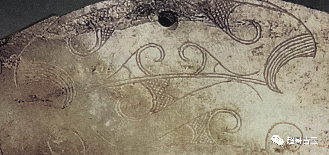 4。此期玉器纹饰细密,其线刻往往细如毫发,这种工艺称为“游丝工” (图22) ,这是小工具勾碗运用熟练的结果。汉以后阴纹的勾线流畅,说明玉工使用工具合适,手法准确,走碗手劲运用得好,阴纹曲线很少有断陀或重复的现象。