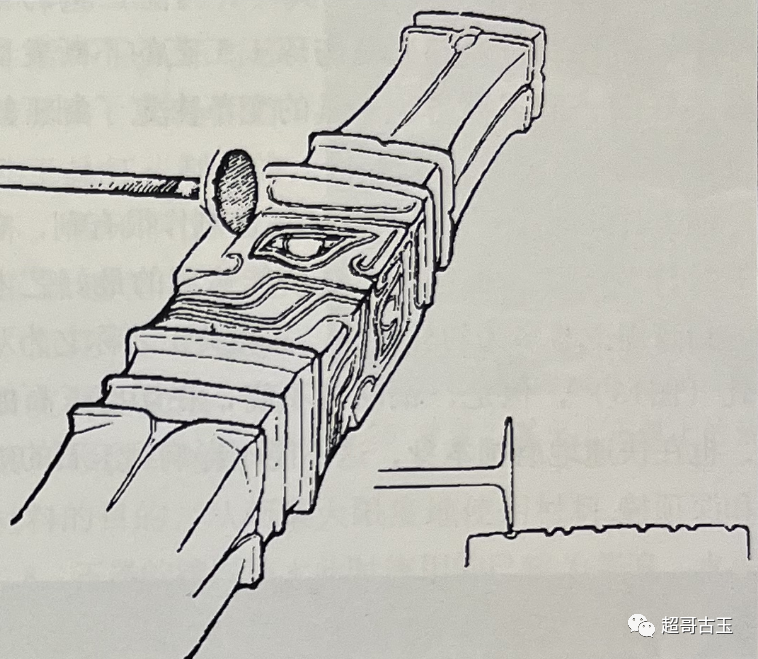 商周时期出现了很多浮雕作品。这些作品形象生动,其工艺技法也相应的复杂起来。浮雕是碾轧、勾撤效果的体现,即用各种形状大小不一的碗轮,在磨玉砂作用下做出的起伏变化的纹饰。碾轧有粗细之分,要求工具形状变化多,即要碗轮大小和形状不一。玉柄形器就是使用几种特殊的碗轮作出的纹饰。制作这种纹饰的技法叫碾轧、勾撤,是玉工用如钉子状碗轮勾轧出的纹饰 (图16)。