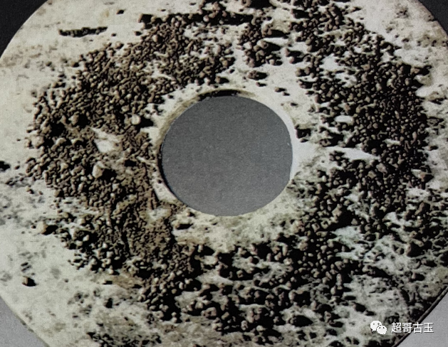 解玉砂在原始琢玉工序中是非常关键的辅助料,因为无论是旋转摩擦还是直线摩擦解玉,都离不开用砂作中介物,原始时代的解玉砂估计是经过筛选的天然砂。江苏武进寺墩良诸文化墓葬中出土的一件玉璧上铺有一层砂粒,系花岗岩粗砂粒,其中硬度高达7度的石英石占30%~40%,这应是史前时代玉工使用的解玉砂 (图6)。