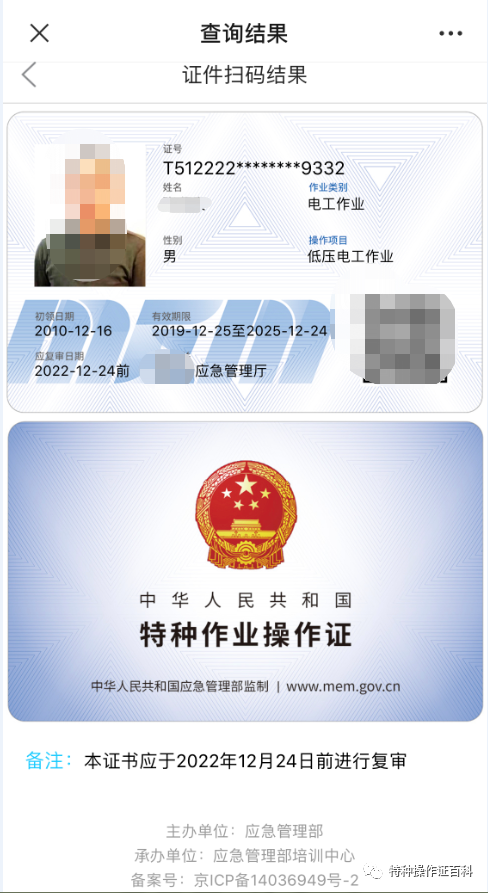 自2010年后,老版特种作业操作证(IC卡)样本改用二代身份证似的IC卡类新版中华人民共和国特种作业操作证样本 ,复审为三年一审,特种作业操作证6年换一次证。电工操作证分为高压和低压,作业电压一千伏以上用高压,作业电压一千伏以下用低压。
