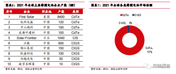 CdTe 目前是主流薄膜电池。2021 年全球薄膜太阳电池的产能 10.7GW,产量 约为 8.28GW,同比增长 27.7%,主要是受 First Solar 产量增长的拉动。