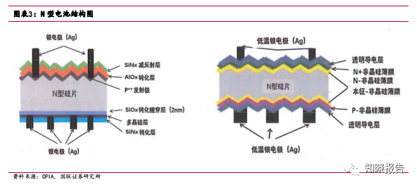 P 型电池制作工艺相对简单,成本较低,主要是 BSF 电池和 PERC 电池。AL-BSF:铝背场电池是最早应用的单晶电池,成熟阶段为 2013-2016 年。BSF 电池是在晶硅光伏电池 PN 结制造完成后,通过在硅片的背光面沉积一层铝膜,制备 P+层,从而形成铝背场。铝背场有减小表面复合率和增加长波吸收等优点,但铝背 场能够反射的长波有限,因此其转换效率有局限性。