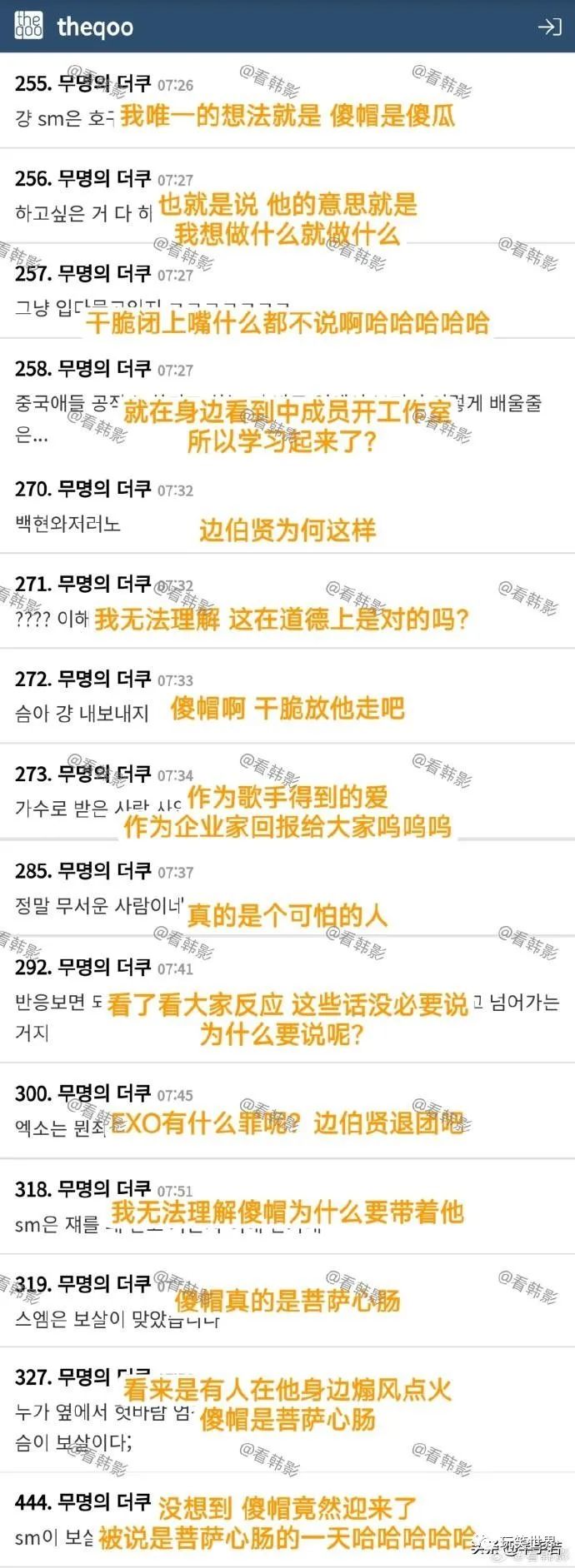 韩流网友在得知此次事情之后,全都在阴阳怪气,说实话小编有点没看懂,要知道边伯贤的解释非常清晰,结果韩流网友一边倒的炮轰他是跑路咖,真的是离谱,真的看不懂韩流网友的脑回路,在小编看来这些人已经被财阀PUA惯了,已经麻木了,完全和资本共情了,人家SM娱乐都同意边伯贤开工作室,结果韩流网友却不接受。