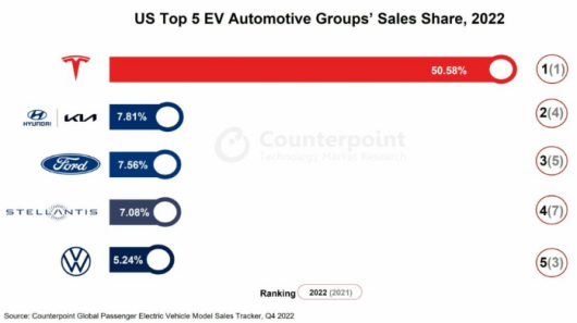 这7家企业的汽车销量占到全美国汽车效率的一半左右,但是在电动汽车市场,特斯拉可谓是一家独大。2022年,全美电动汽车(包括插混)销售中,特斯拉占据50%的市场份额,比后17名加起来都多。