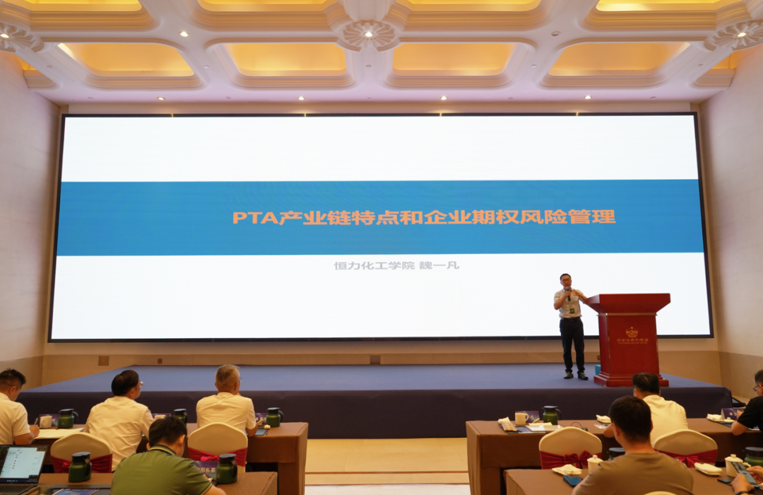 恒力化工学院副院长魏一凡围绕PTA产业链特点和企业期权的风险管理发表了自己的研究成果。他详细讲解了PTA全产业链上下游产业特点和应用场景,介绍了PTA品种通用的研究框架。他指出,PTA价格的逻辑主要是源于成本端推动和需求端拉动,成本端的重要逻辑是调油逻辑,成本推动最终引发需求下滑。在期权风险管理上,他通过理论结合PTA企业期权实战案例,向与会嘉宾推广了利用期权作为企业交易策略的优势以及企业一般交易流程。