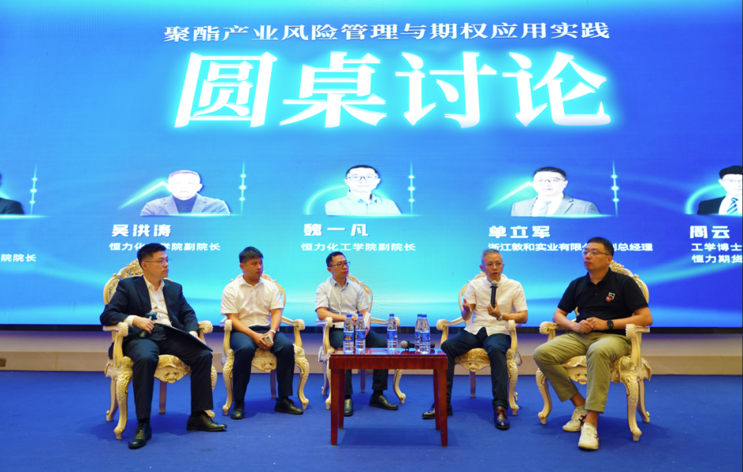 圆桌讨论由恒力期货研究院院长刘文波主持,魏一凡、吴洪涛、单立军、周云四位嘉宾围绕“复杂宏观背景下的聚酯产业供需市场格局、如何利用期货期权工具降低经营风险”等专题进行了深入交流和讨论,将整个议程推向了高潮。