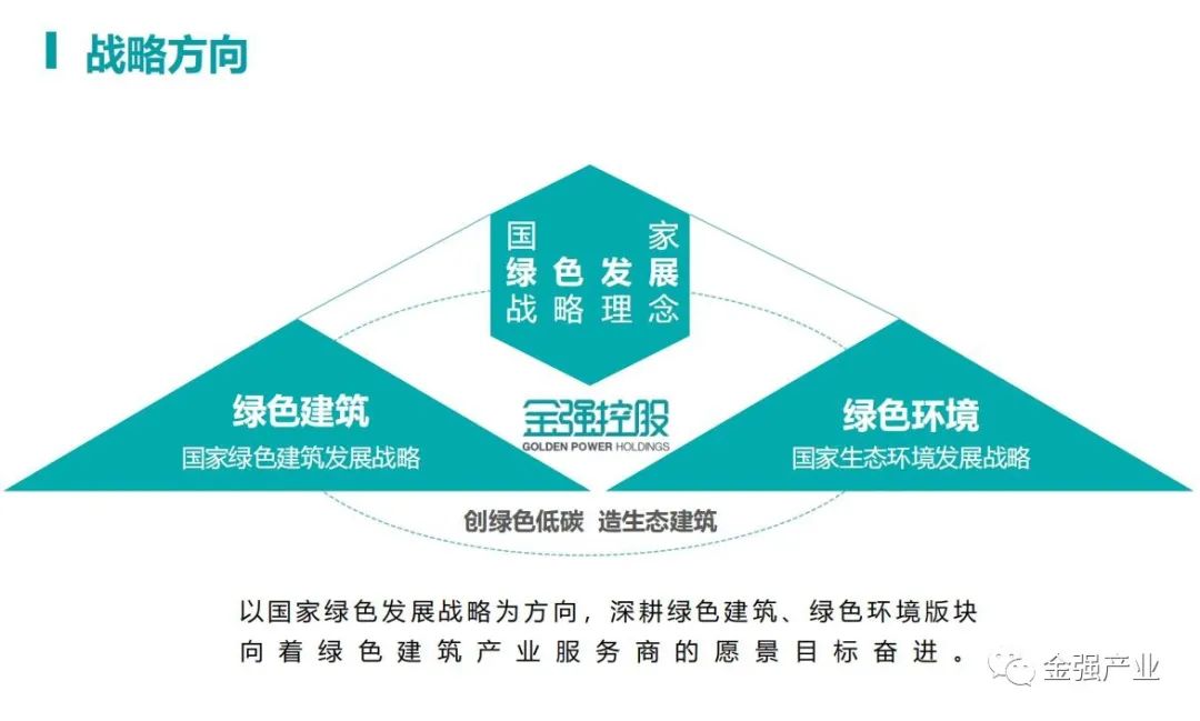 金强控股集团为全面落实国家绿色发展战略理念、践行企业责任,推进集团“十四五”时期 生态转型,建设“绿色金强”,以科技创新、数字化转型为抓手,深入贯彻中央关于“双碳” 建设相关要求,助力国家“碳达峰”“碳中和”目标实现,通过规划金强“123”绿色发展模式,打造绿色建筑到绿色环境的绿色产业生态闭环,致力于人及建筑与环境的和谐相处、 永续发展。实现集团绿色、低碳、零碳转型,以绿色思维实现绿色发展。